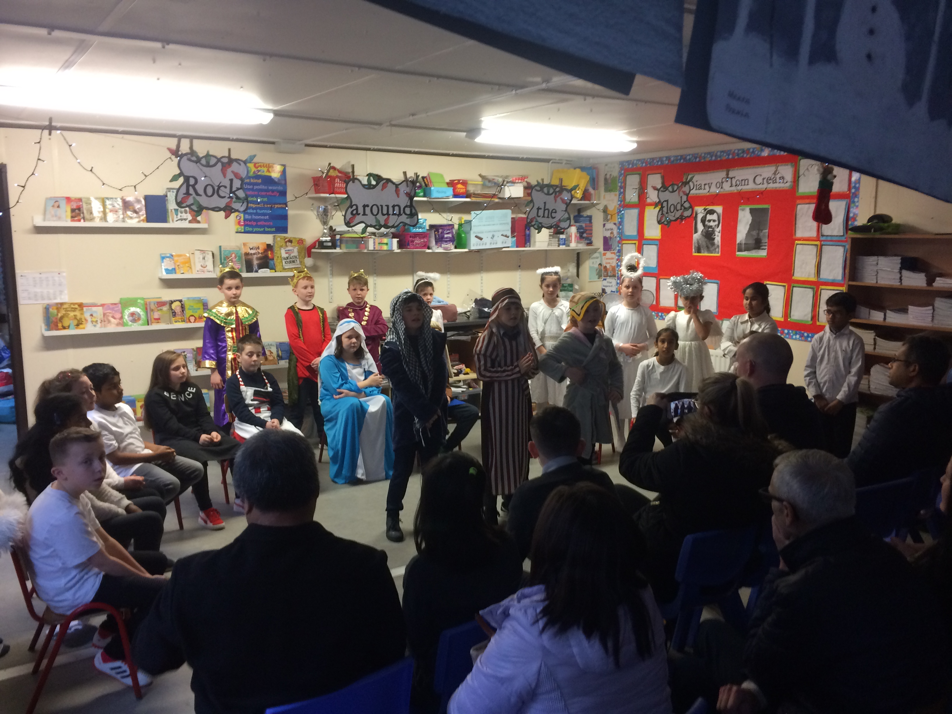 ‘Forgetful Santa’ tells us of how Santa is getting ready to leave the North Pole on Christmas Eve, but knows he has forgotten something! The reindeer , elves and Mrs. Claus all help him to remember everything we need for Christmas, especially the real meaning, The Nativity. Well done to all the children, their class teacher & helpers for putting on a great show!