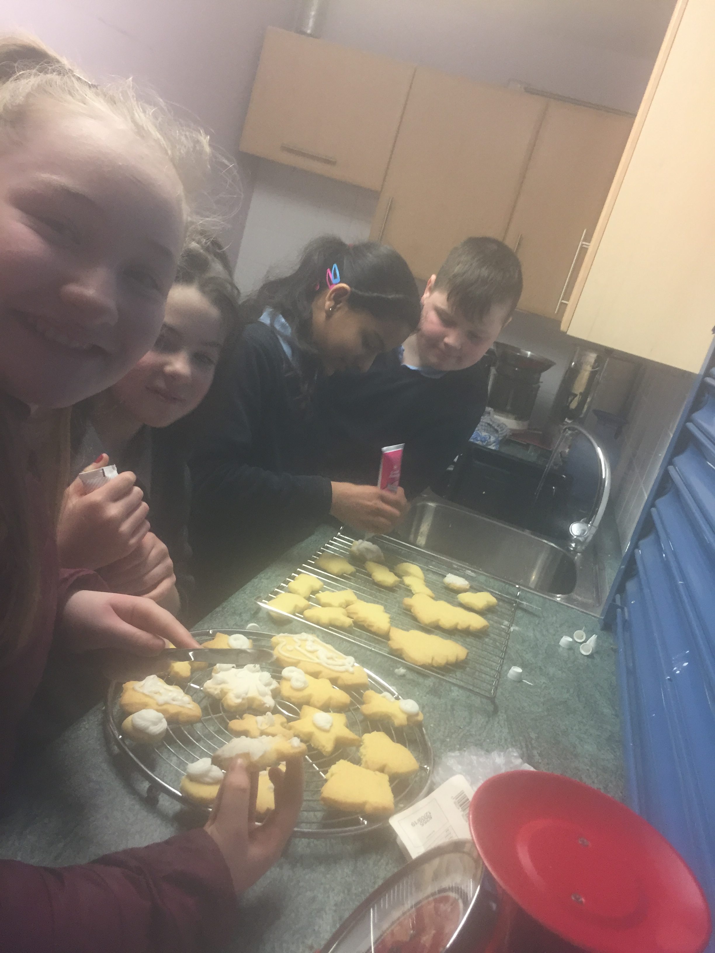 Arya, Charlotte, Patricia & Marc making Christmas shortbread cookies with Ms Lynch. The children followed the recipe and decorated them! They tasted delicious!