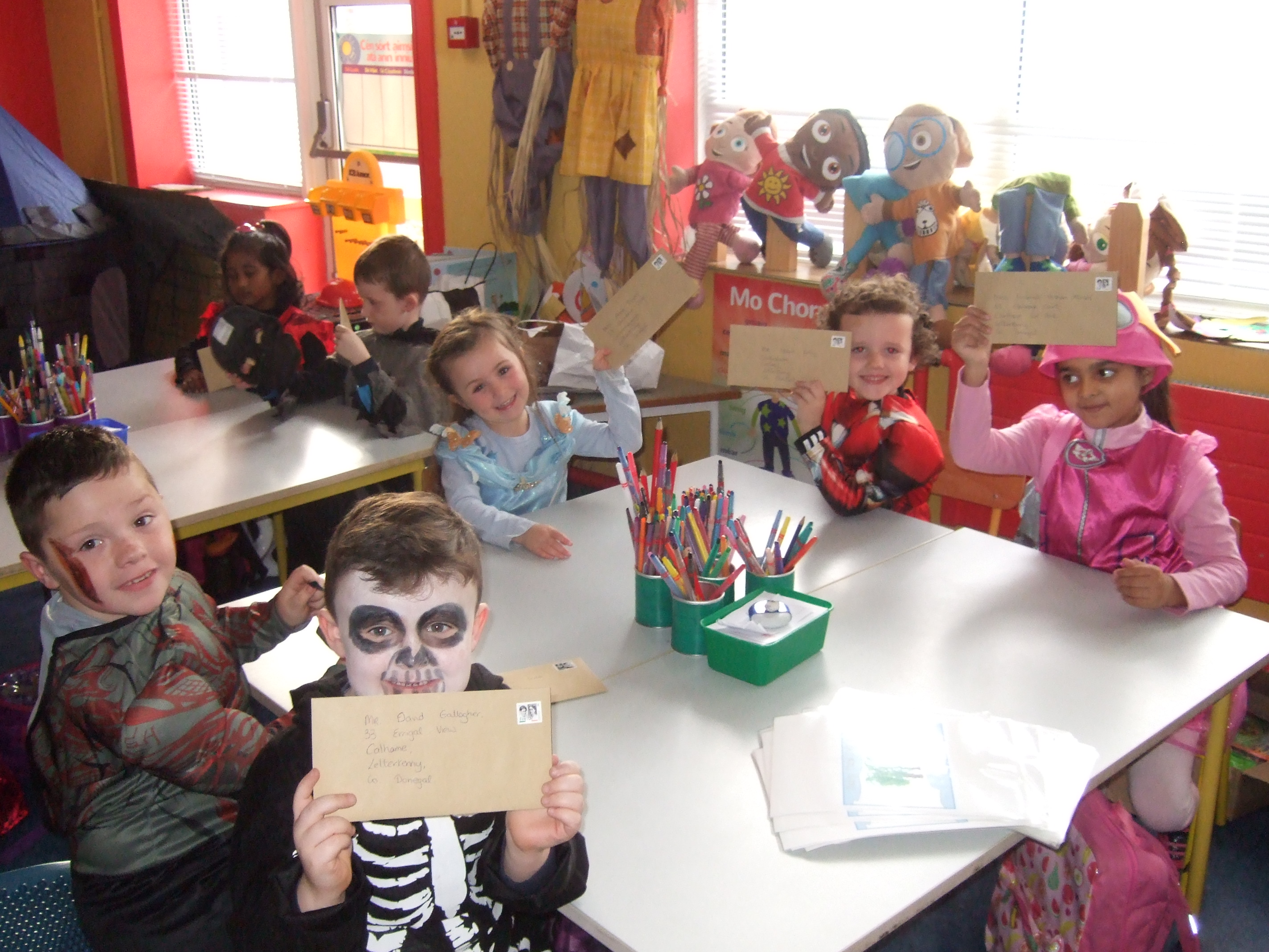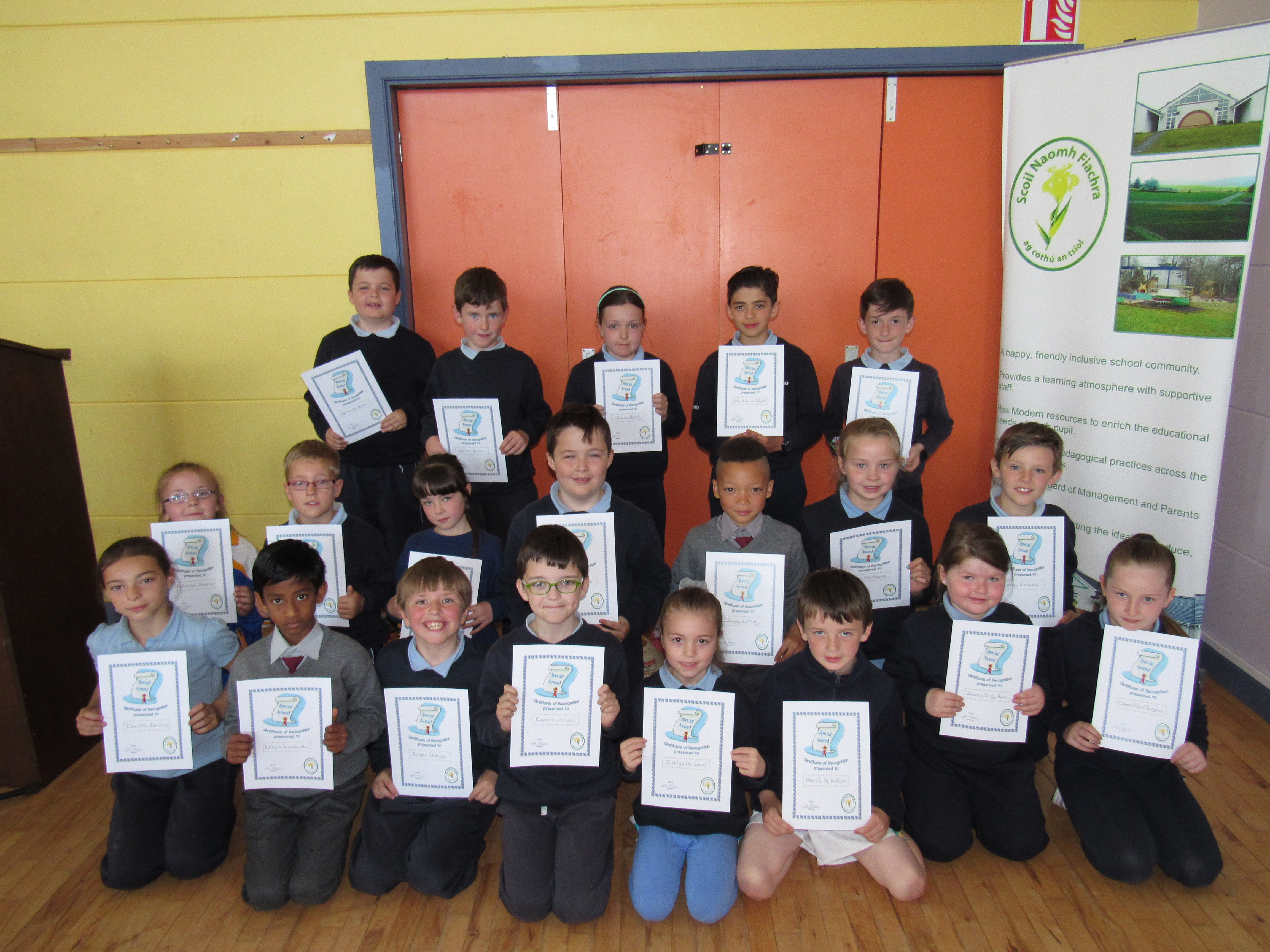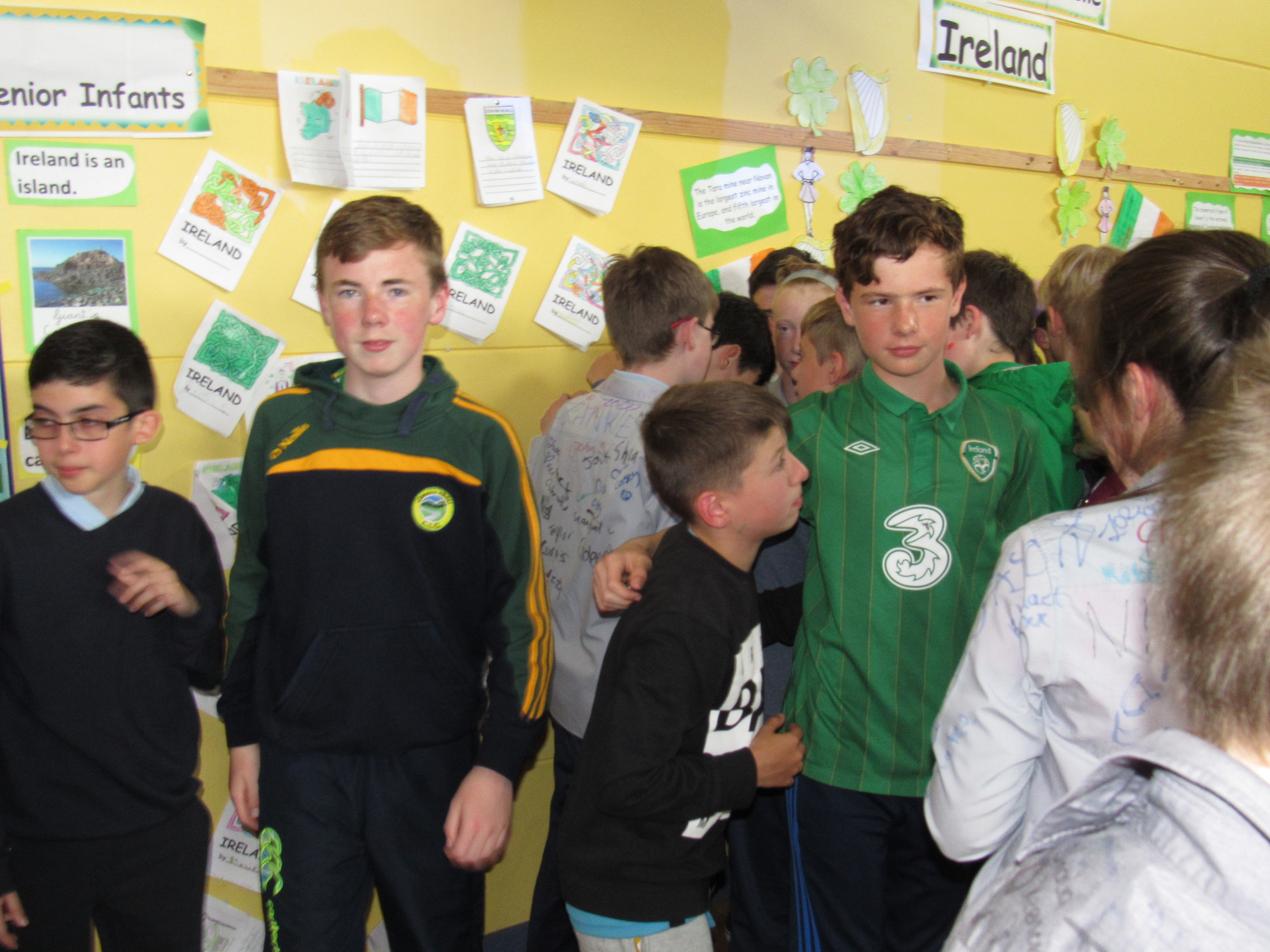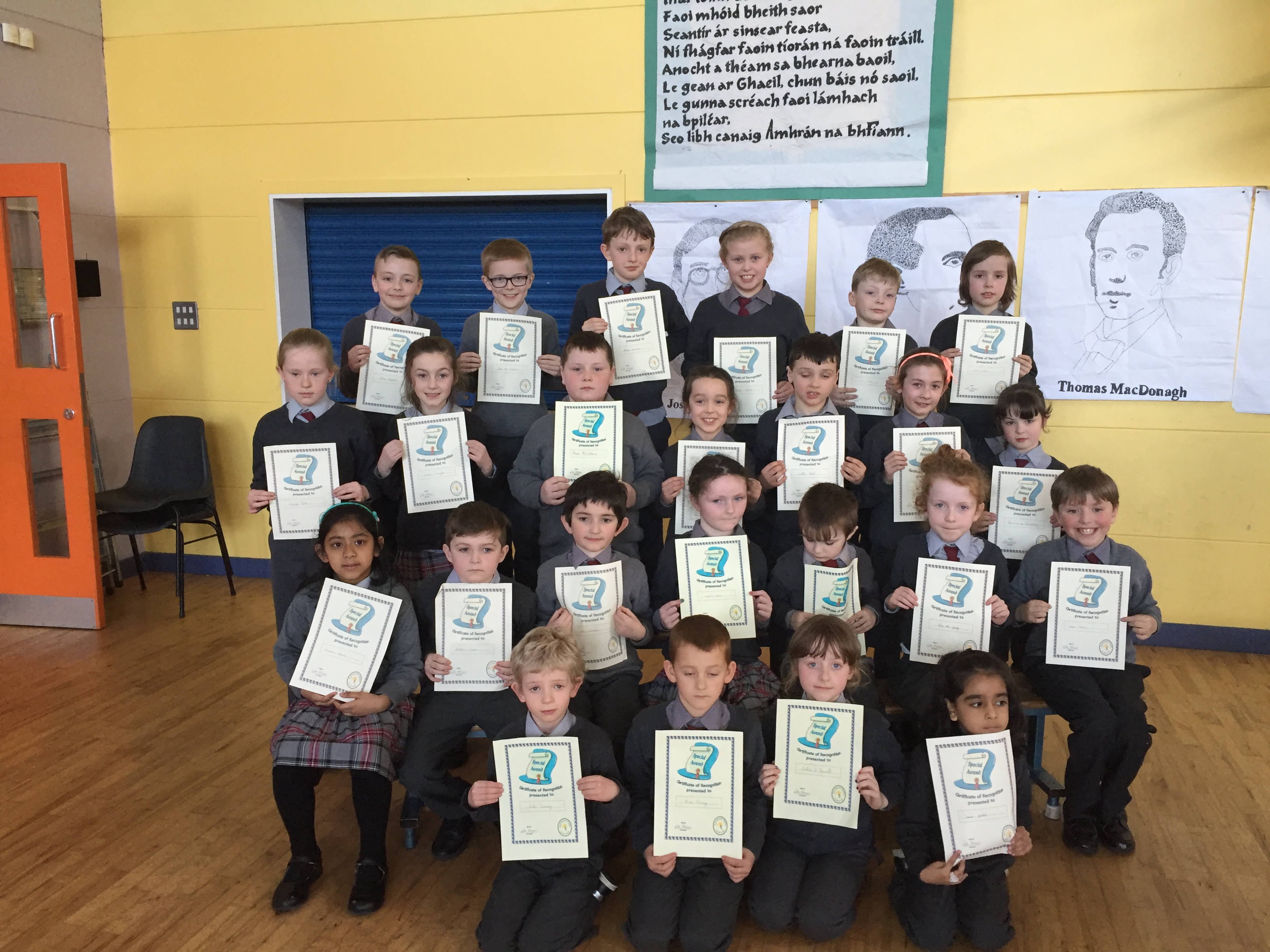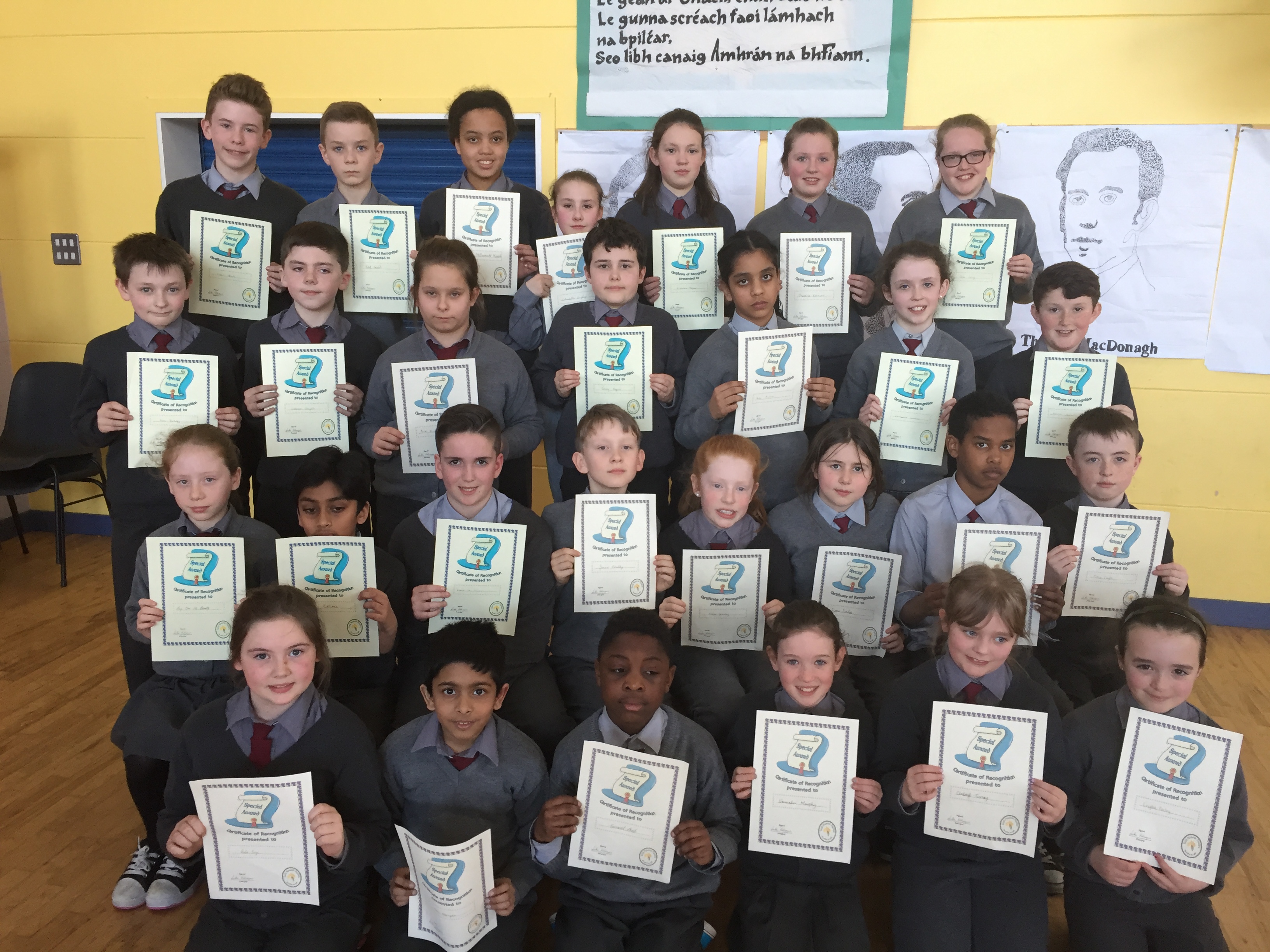 During the week, Seachtain na Gaeilge, older classes joined with younger classes and read Irish books together. Also many classes began to write their own Irish books, Scríobh Leabhar. Pupils also took part in a Toraíocht Taisce (treasure hunt).