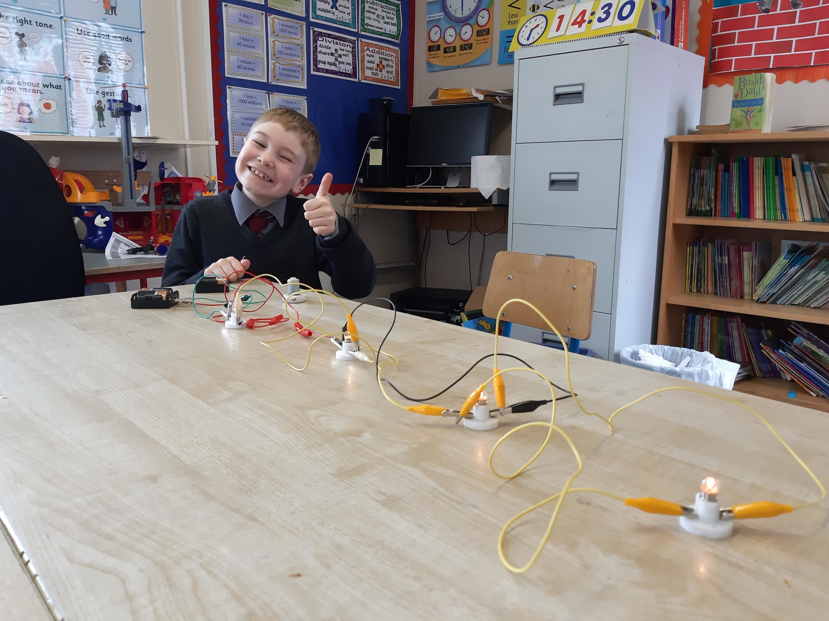 Pictured below is Larry from 2nd Class working with circuits. He did lots of investigating and extending the circuit by adding more bulbs. Well done our Little Scientist!