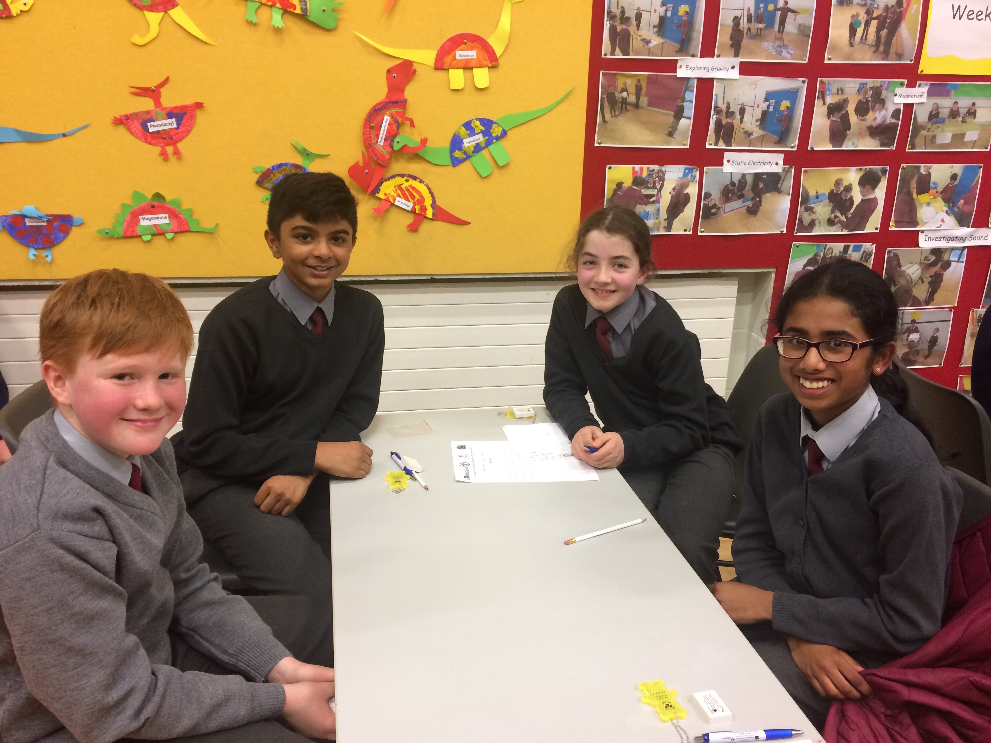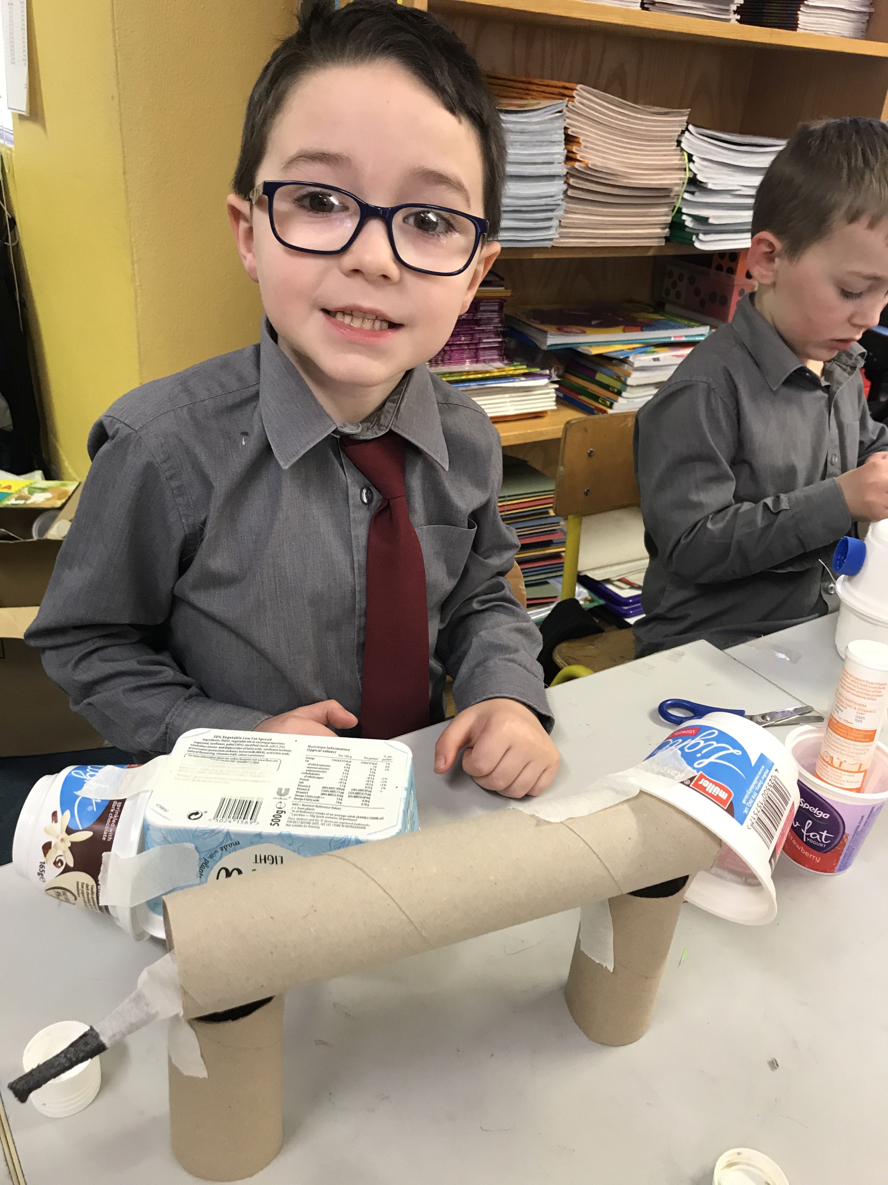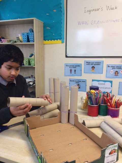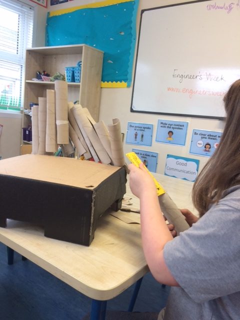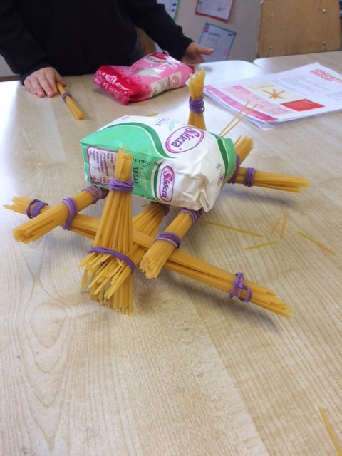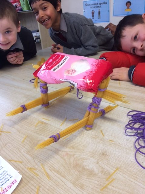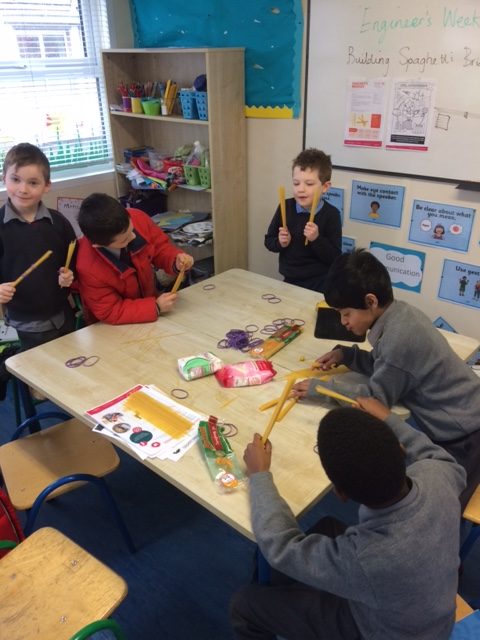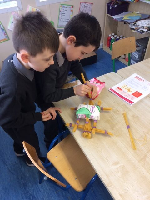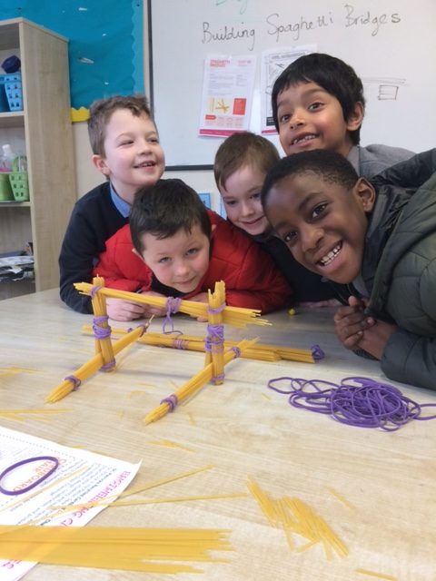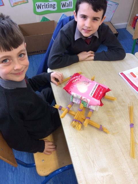 Ms McLaughlin’s and Ms Dillon’s 1st classes working as civil engineers for Engineer’s week. Their task was to build a bridge to hold half a pound or just over 200g of weight using only spaghetti and elastic bands. One group managed to put 700g of weight on their structure! Well done to everybody involved.