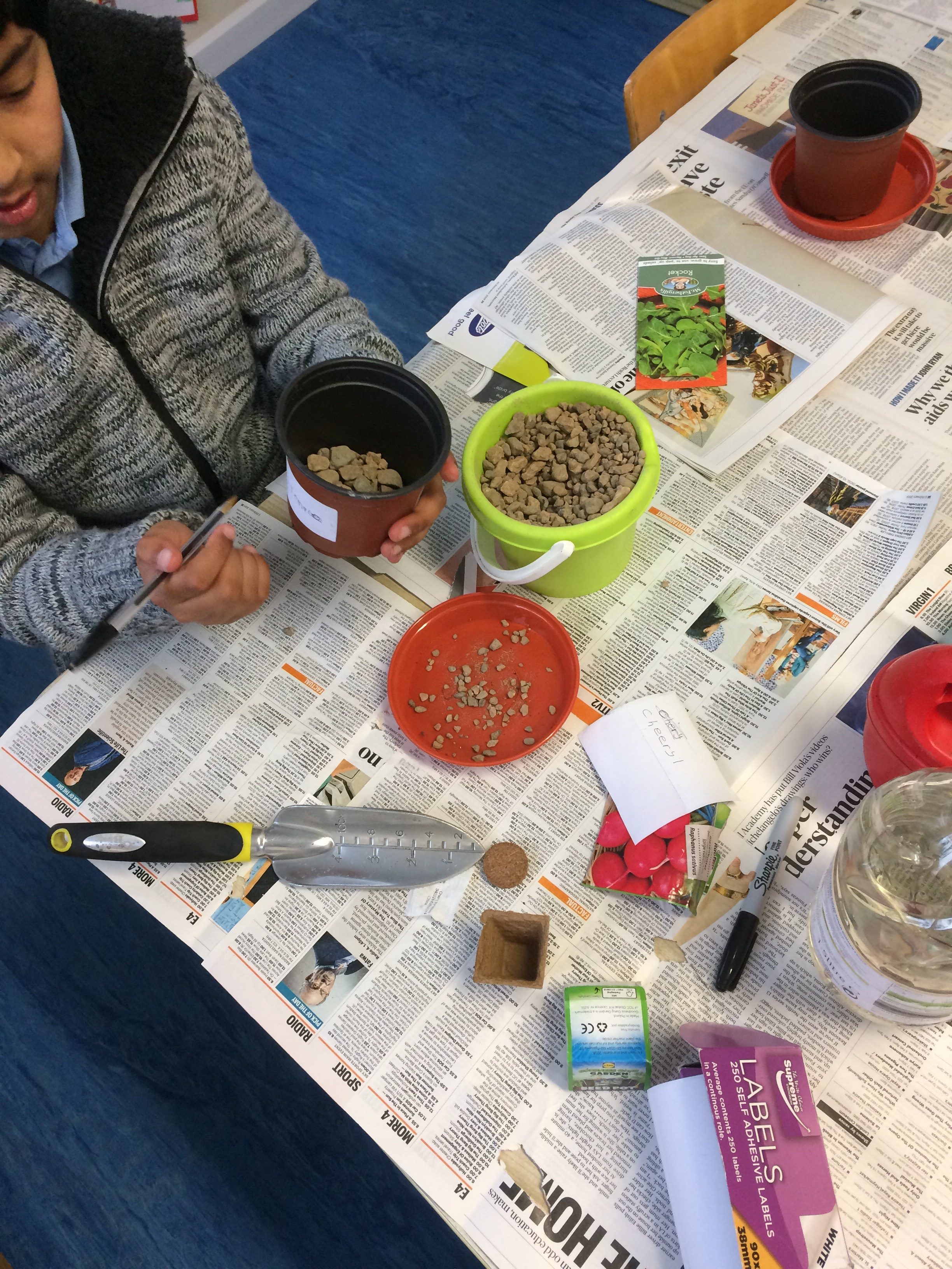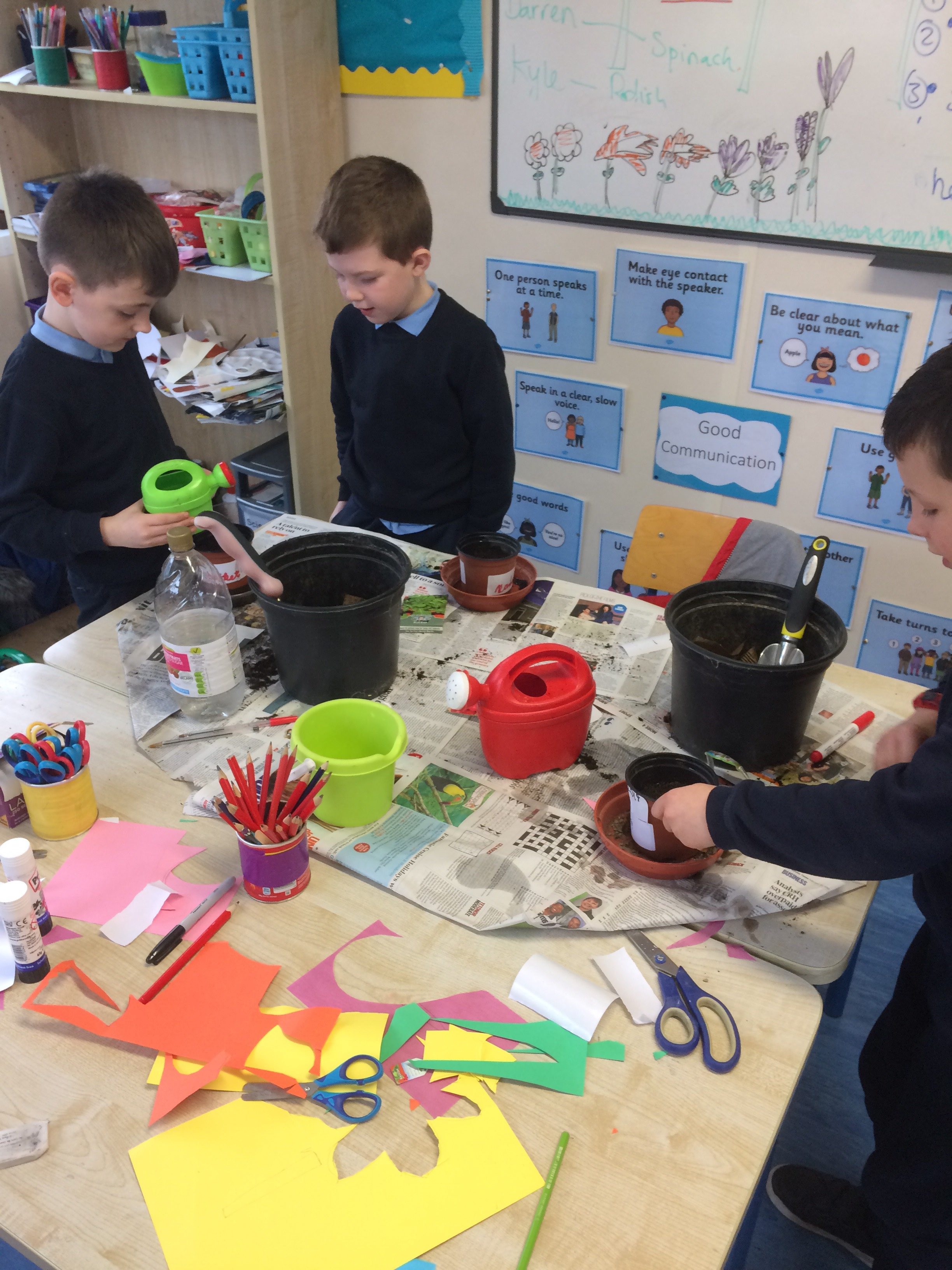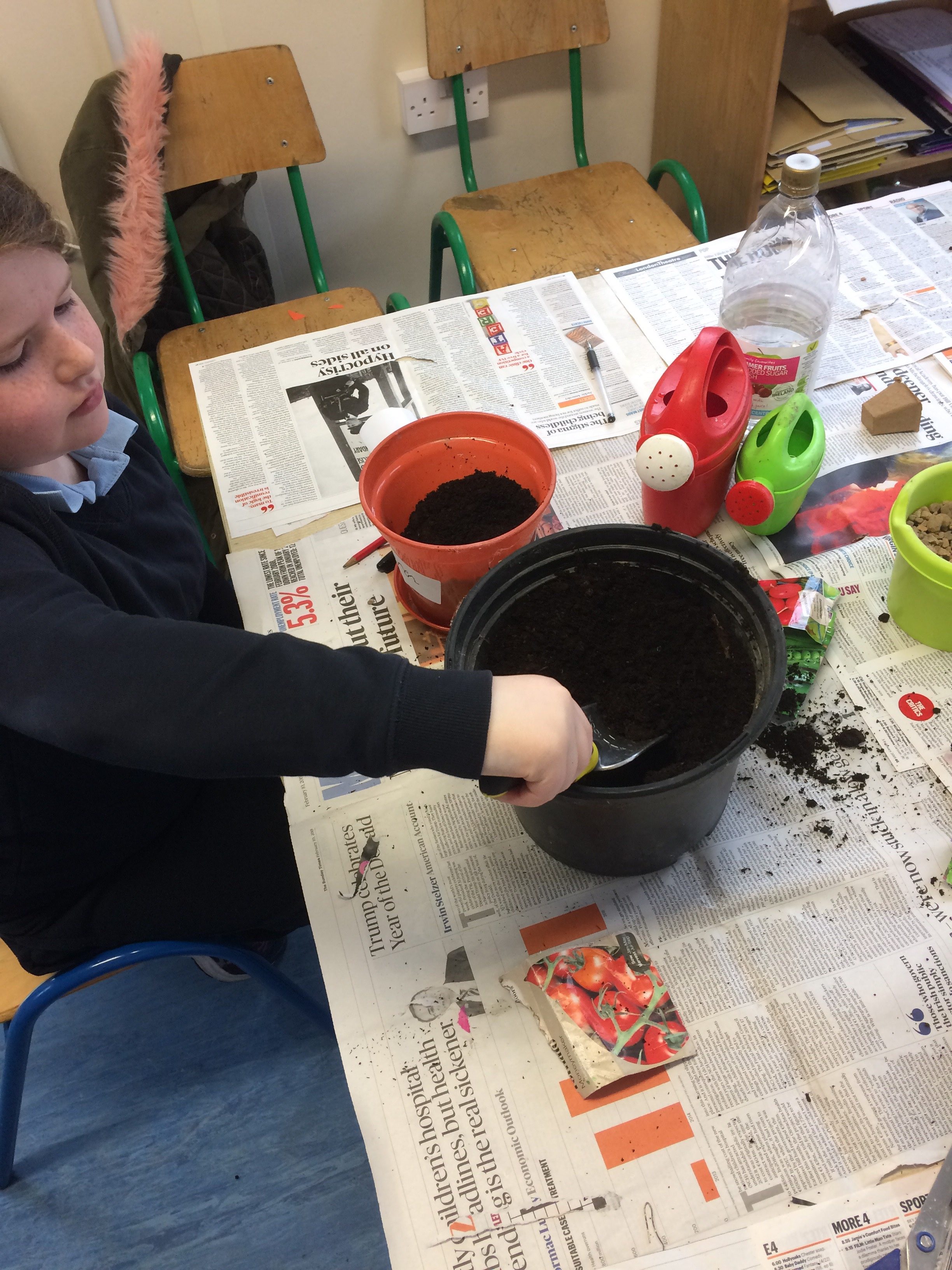 Pictured below are children from 1st, 3rd, 4th and 5th planting vegetable seeds. They planted rocket, radishes, peas, spinach and tomatoes. The children can’t wait to see them in a few weeks.