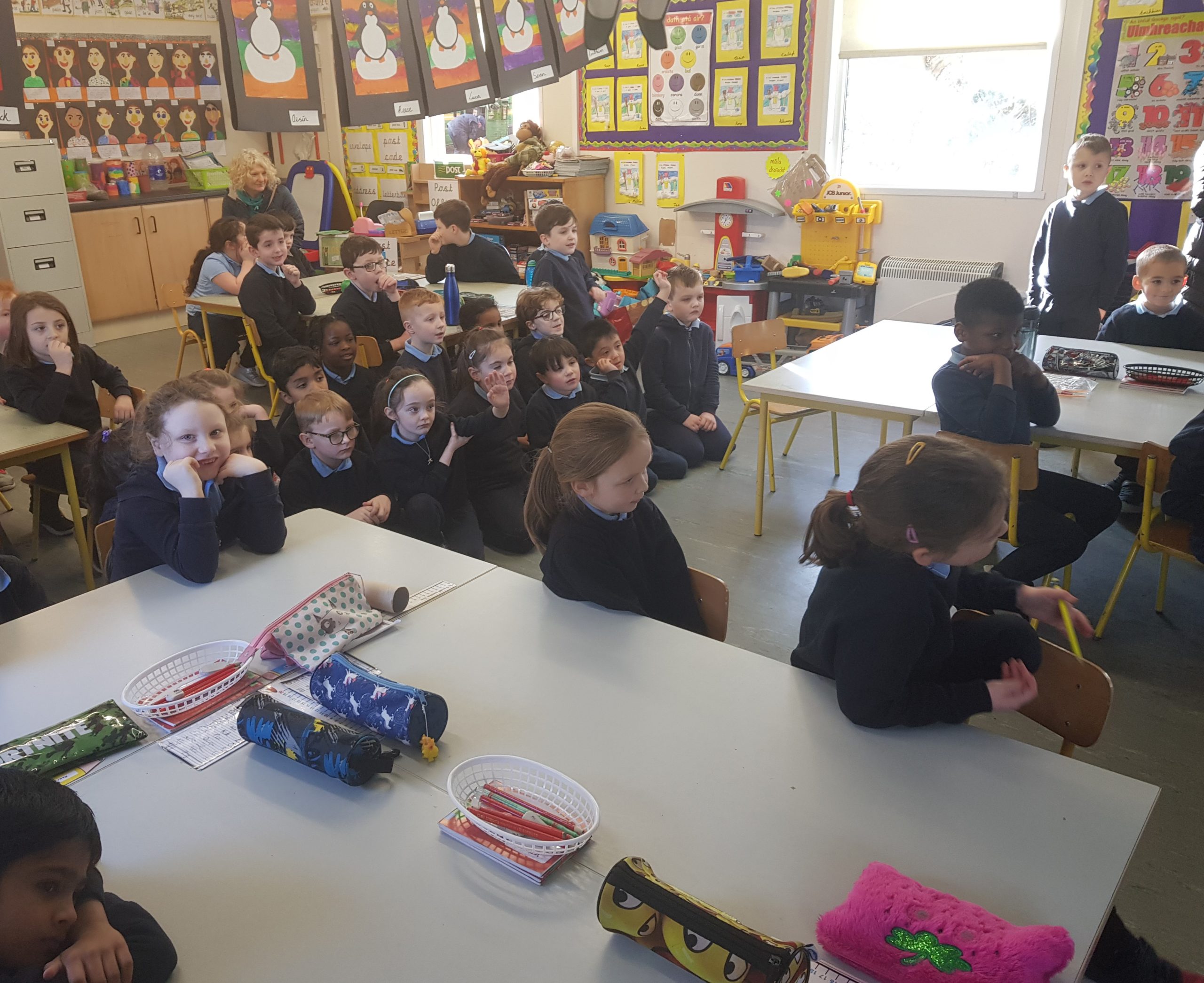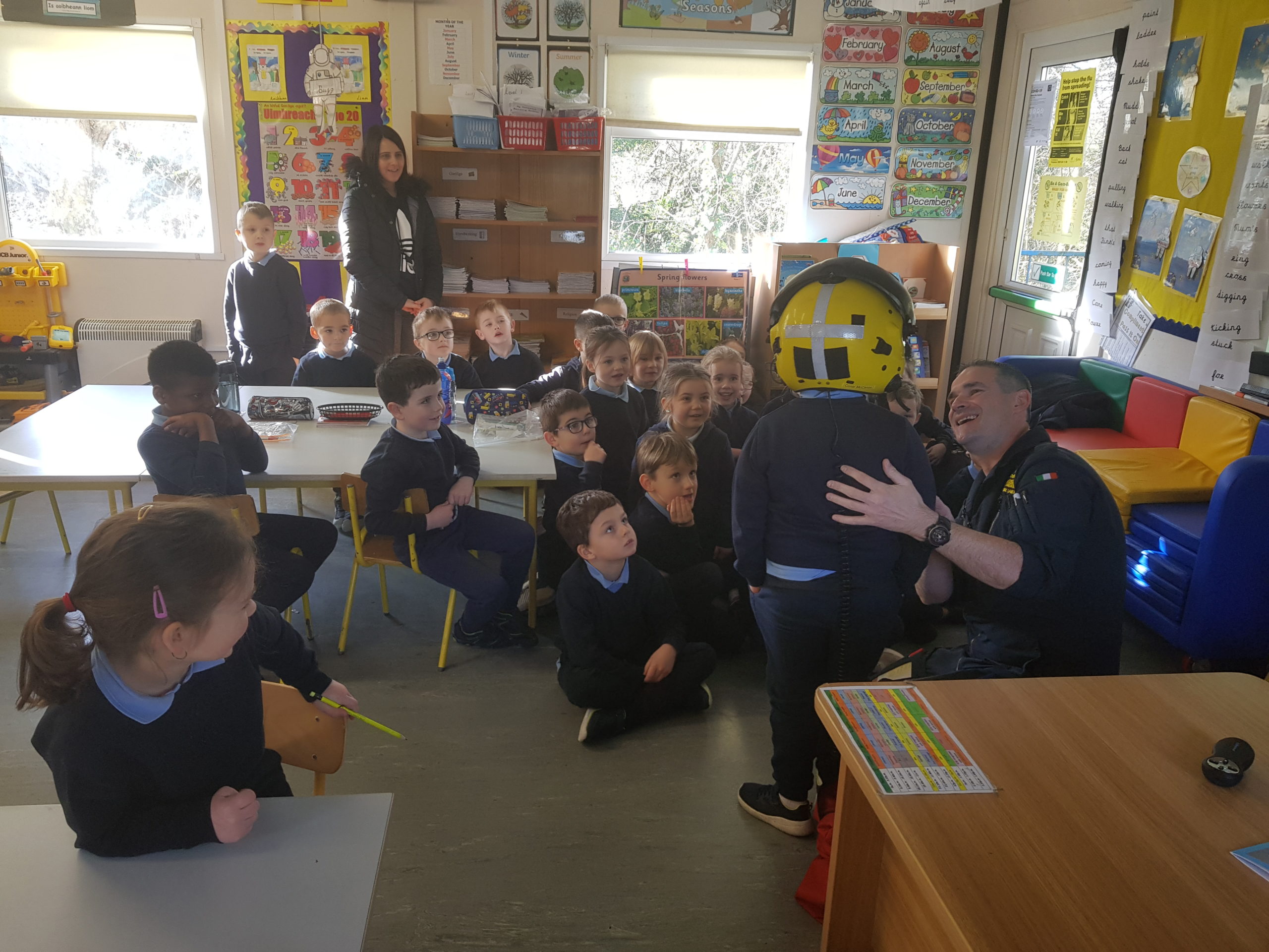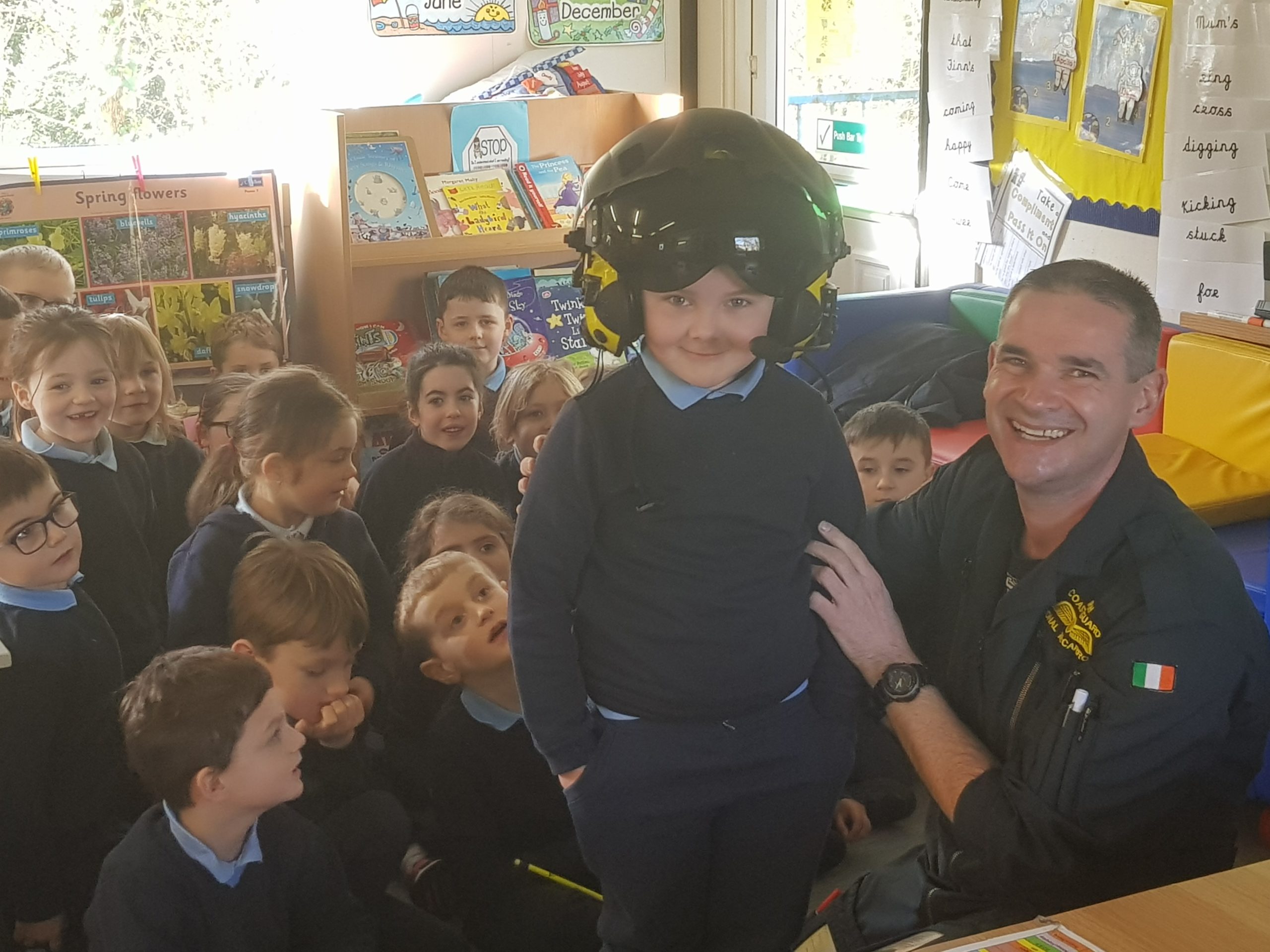 Senior Infants have been learning about ‘People at Work’ in SESE. Oisín McCarron in Senior Infants dad came to visit us to discuss his job in the Irish Coast Guard. He discussed his role in rescuing people at sea, from mountains, crashes etc in the Sikorsky S-92 helicopter. Senior Infants had many questions for him and Mr McCarron left ‘Safety Squad’ books, wrist bands and some prizes for those who completed their ‘Safety Squad’ books at home. A massive thank you to Conal McCarron for his visit.