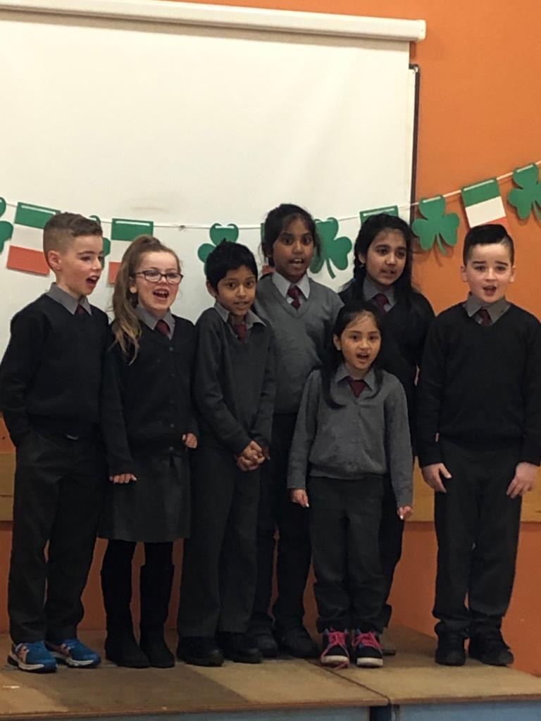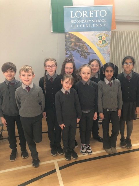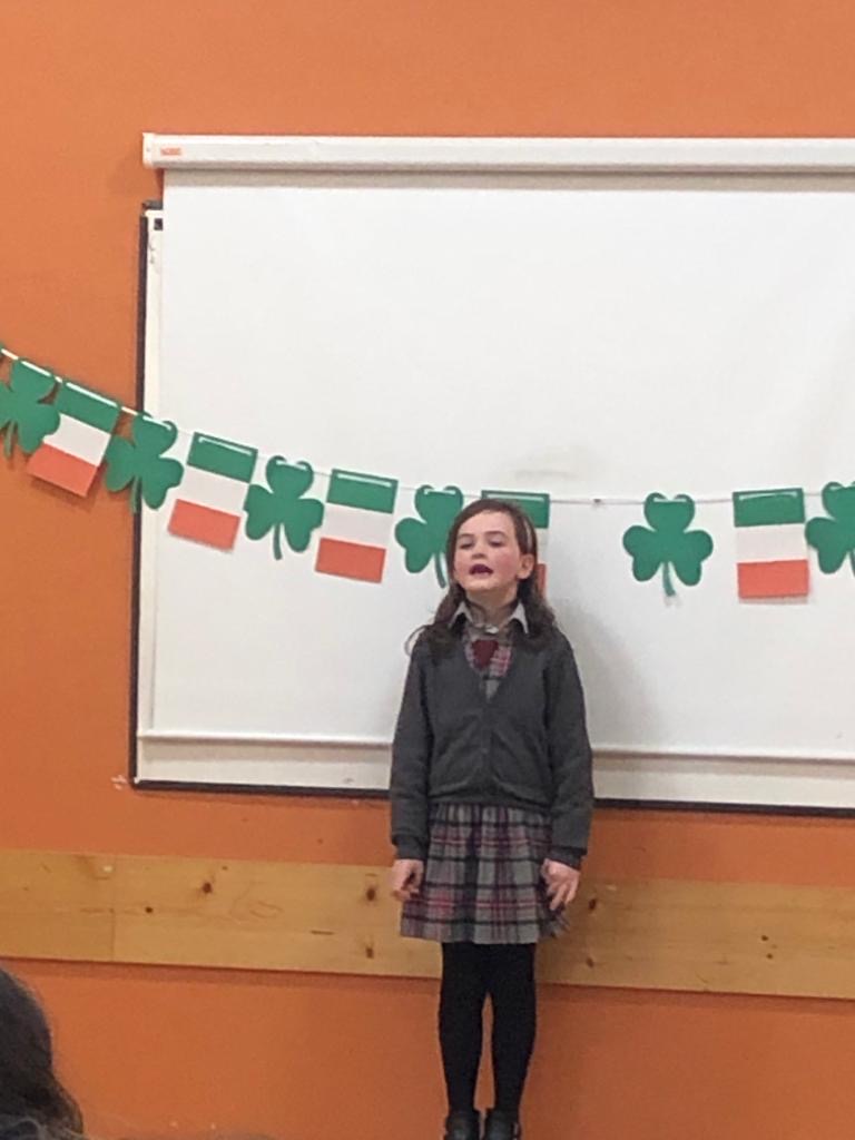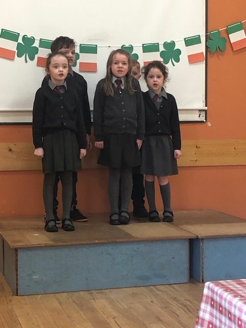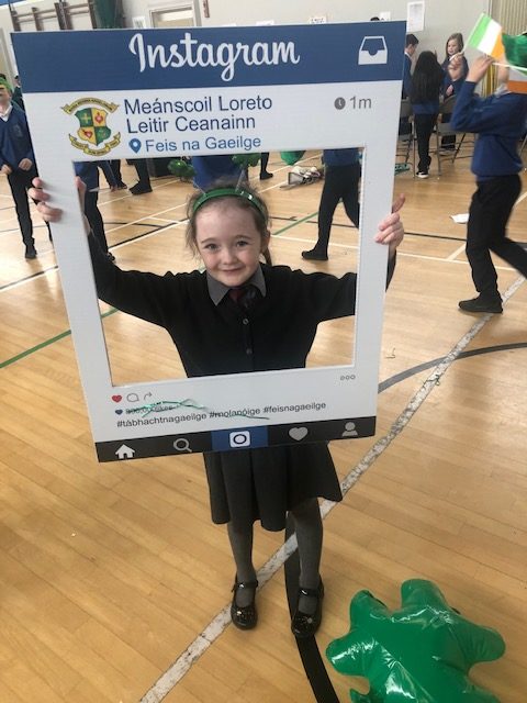 Comhghairdeas mhór do na páistí a ghlac páirt i bhféis Gaeilge i gClochar Loreto Dé Máirt 3ú Márta. Bhí sé chomh deas éisteacht leis na páistí ó rang Ms. Ferry, Ms. McGee, Mr Gallagher agus Ms. Gormley ag déanamh rann agus amhrán ar an ardán. Thug muid fearadh na fáilte ó na múinteoirí agus ó na scólairí i gClochar Loreto. Fuair na páistí bosca pop arbhar agus fuair na múinteoirí cupán deas tae! Bhí muid iontach sásta nuair a fuair muid cúpla duais fosta. Fuair Ollie Haran scoláire na féise-éacht mhór dó! Maith thú Ollie! Rinne sé job iontach leis an dán An Leipreachán. Tá muid ag dúil go mór le seachtain na Gaeilge a cheiliúradh inár scoil féin.