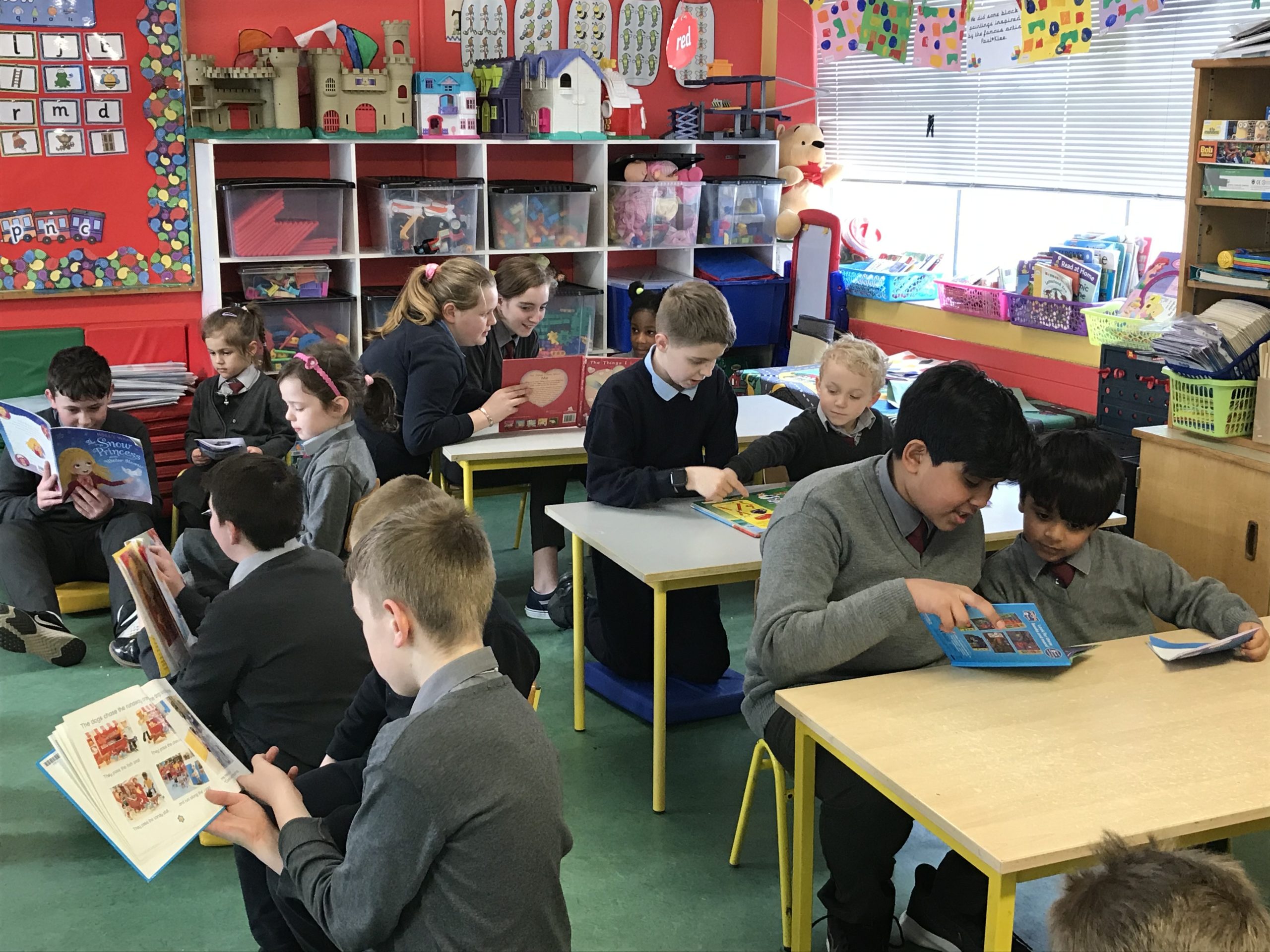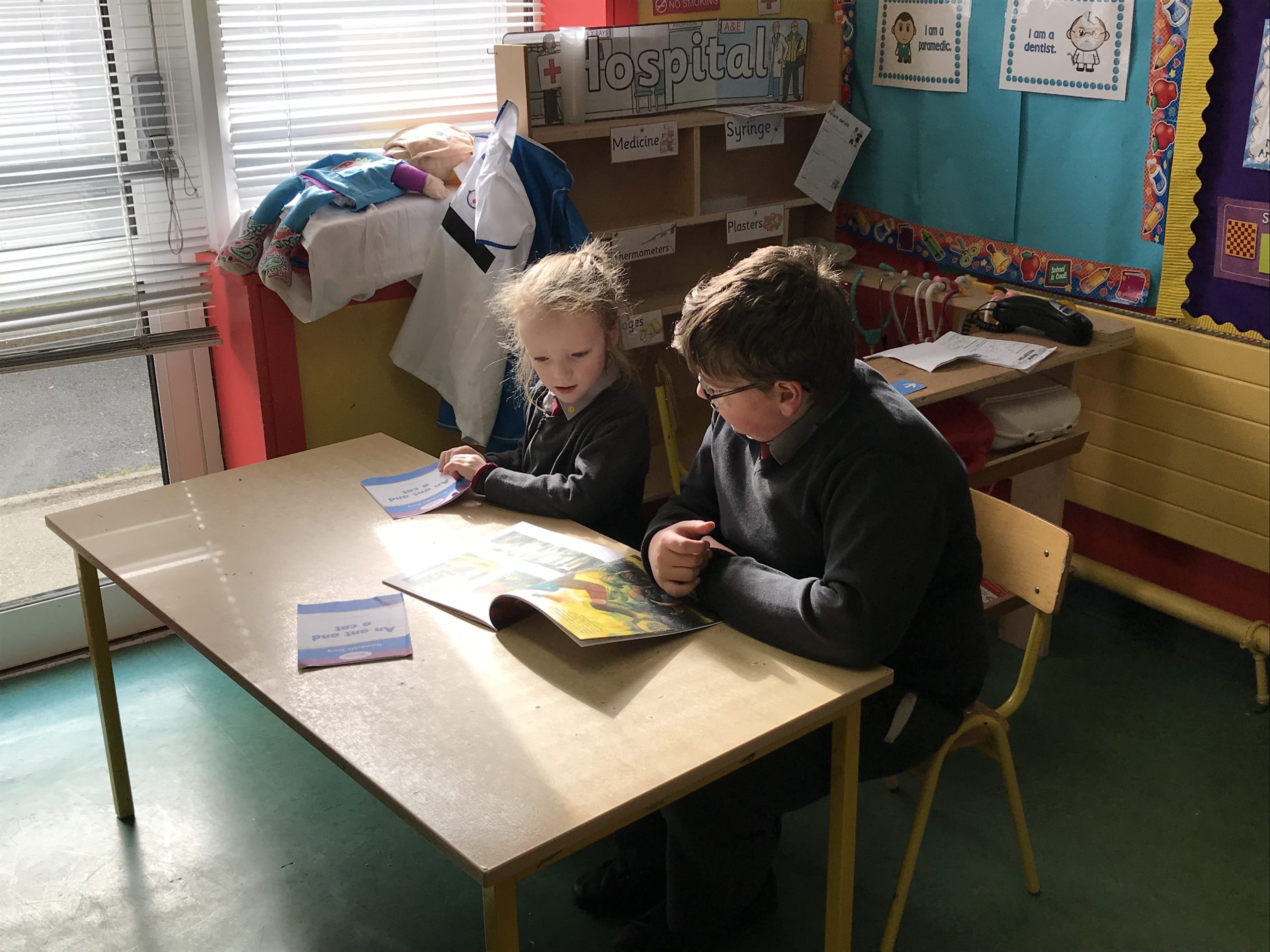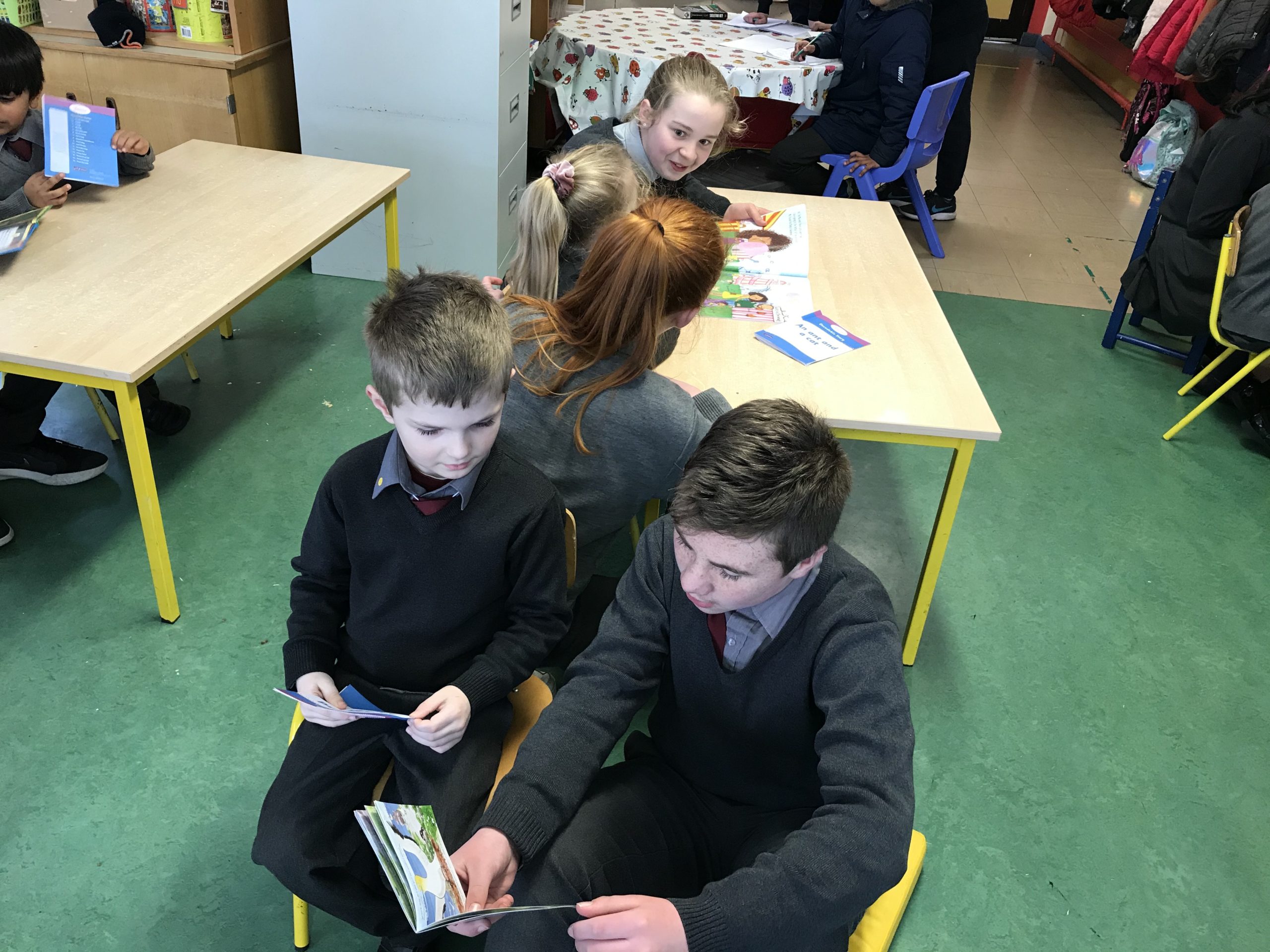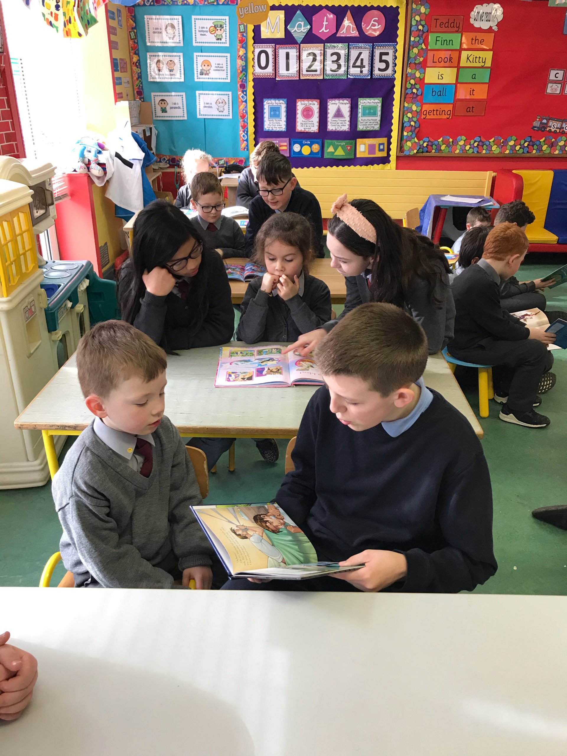 Pictured below are Ms. O’Donnell’s 6th Class & Ms. Lafferty’s Junior Infants celebrating World Book Day. 6th Class students read stories to Junior Infants and discussed their favourite characters, events and books.