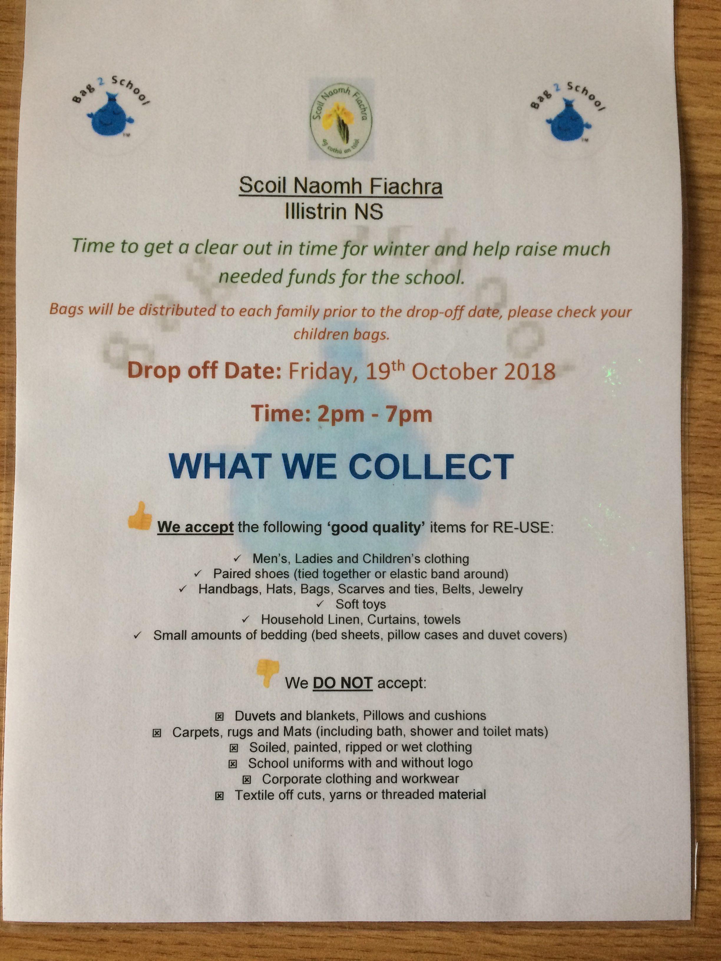 Our Parents’ Association has organised a BAG TO SCHOOL collection. Good quality, clean items can be bagged and dropped into the school on Friday, 19th October from 2.00pm to 7.00pm. You can use any bag for your donated items. Please support this environmentally friendly initiative and help raise funds for our school.