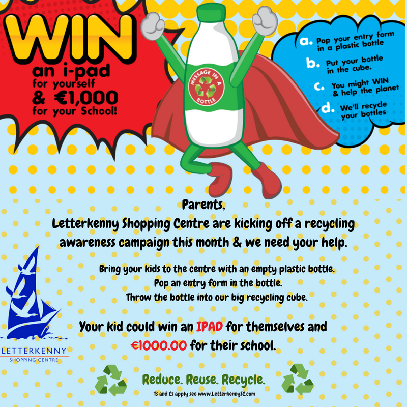 The competition is part of a recycling awareness campaign. Letterkenny Shopping Centre will have a large cube in the centre from October 8th – October 26th and they are asking our local children to come to the centre, complete a simple entry form, put it in an empty plastic bottle and drop the bottle into the cube. A winning ‘bottle’ will be selected on October 25th and the lucky winner will win an iPad for themselves and €1,000 for their school.