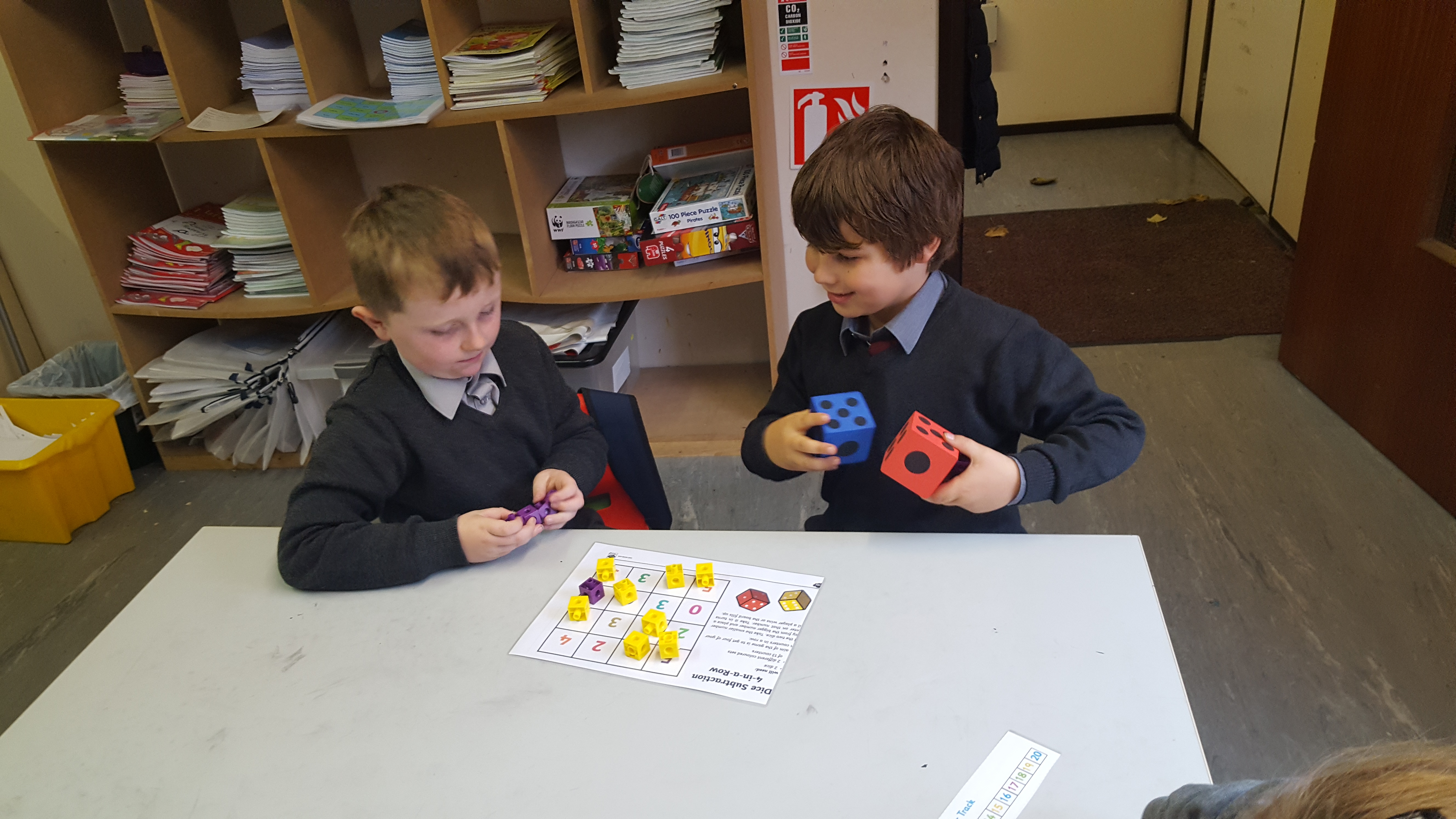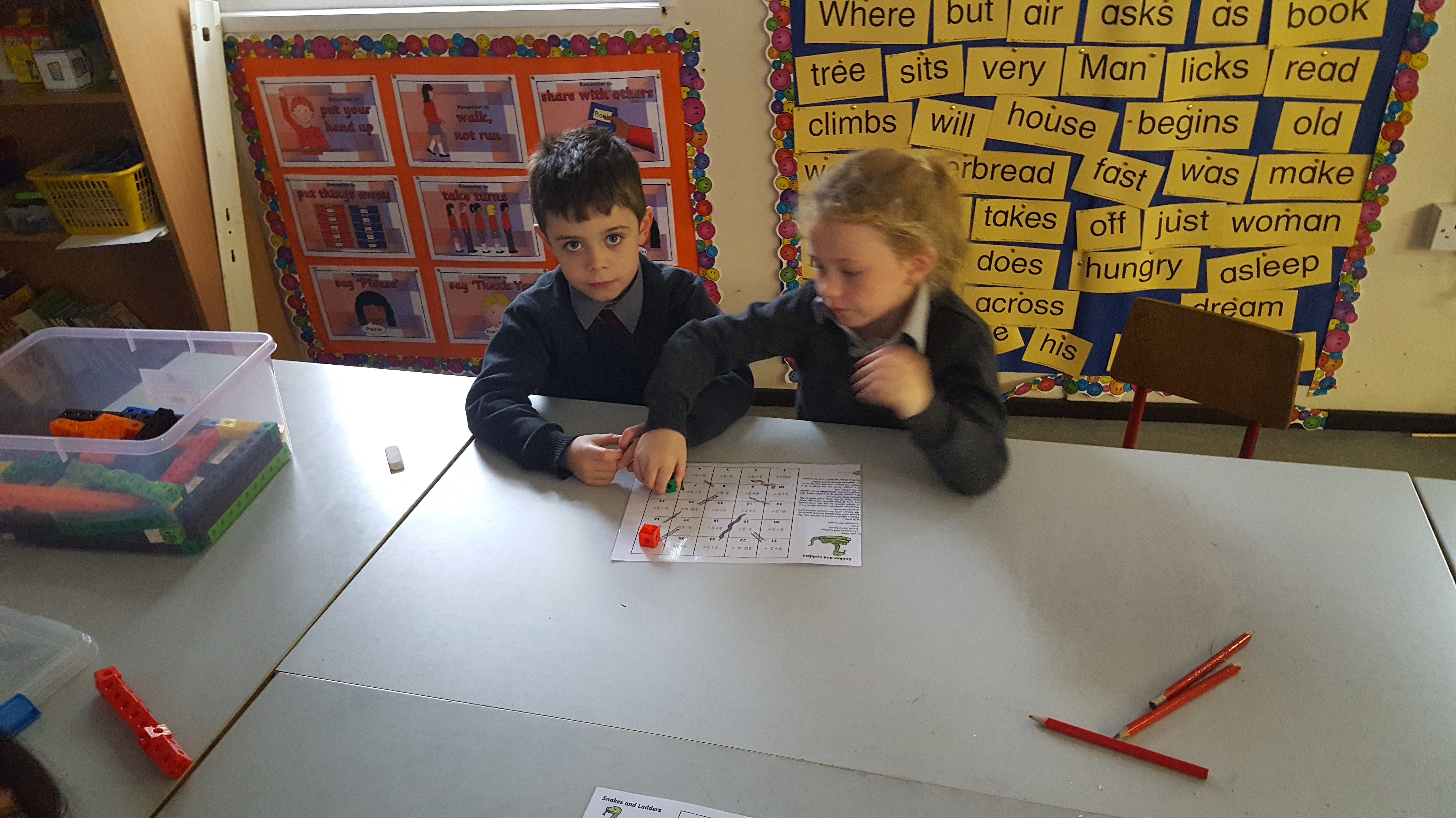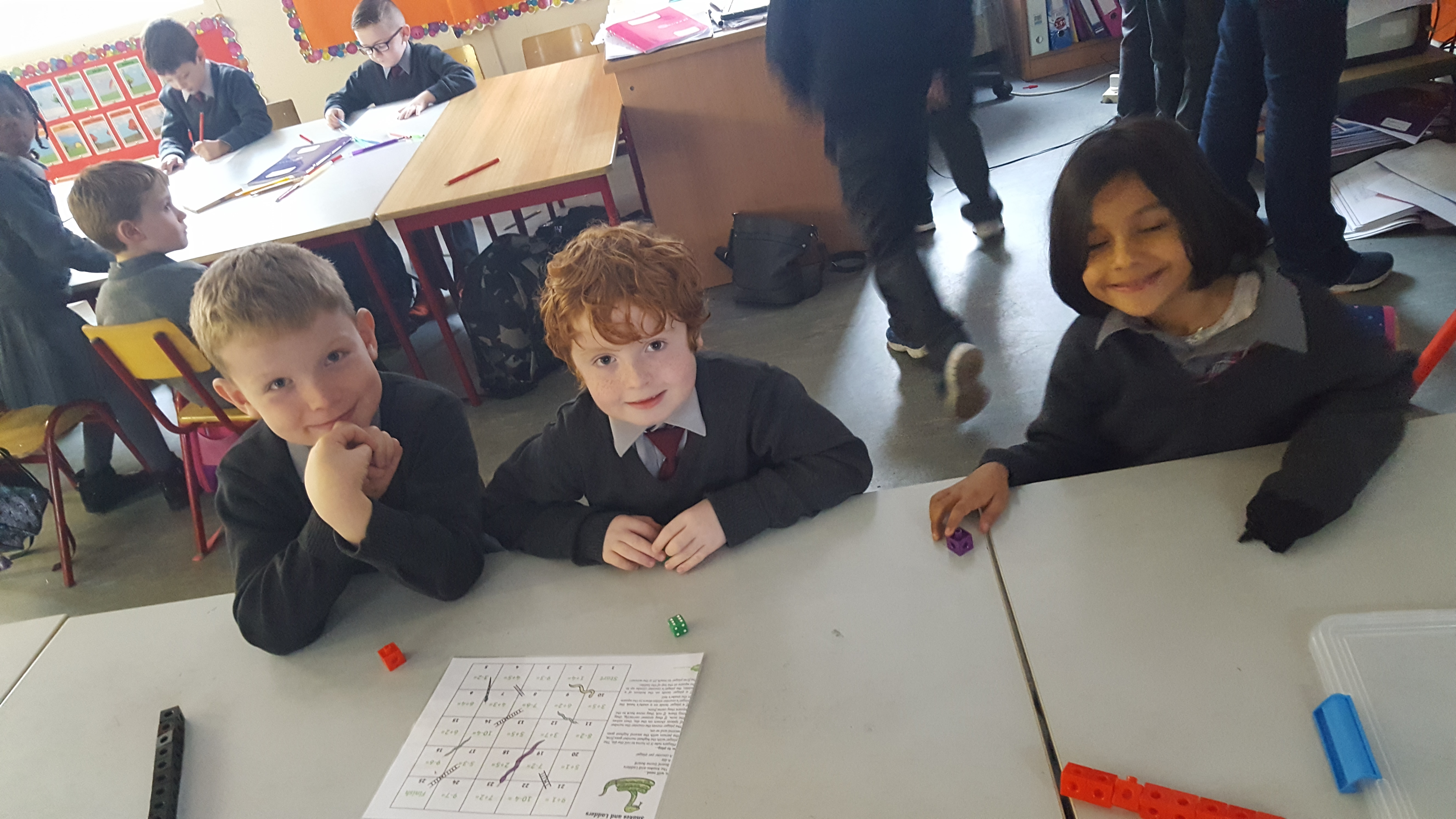 Every Friday, the class do maths stations. There are 5 different activities and the children move around the classroom from station to station. The children play games such as Addition Snakes and Ladders, 4 in a Row, Forwards and Backwards, Add on Tiles and Racing Cars. They also play fun games on iPads and the interactive whiteboard. Everyone has great fun playing the games while practising various maths skills.